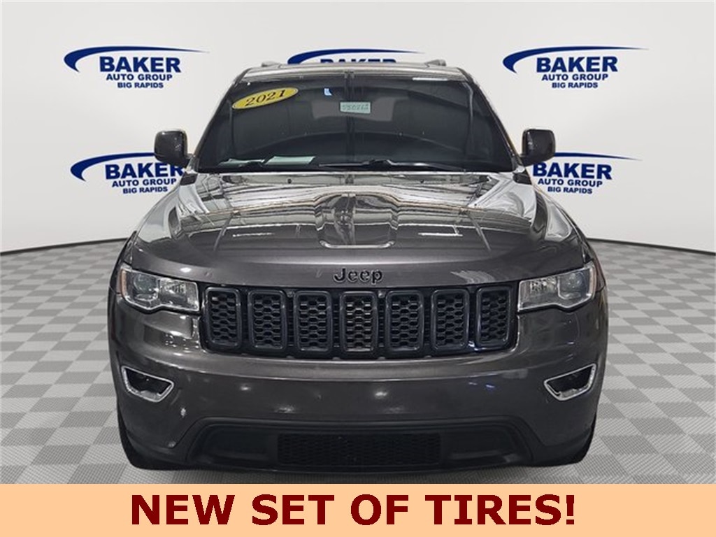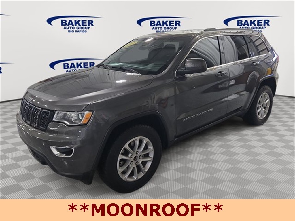 NEW TIRES on this 2021 Jeep Grand Cherokee Laredo E 4x4 Granite Crystal Metallic Clear-Coat with Black Cloth Interior Powered by the proven 3.6L V6 24V VVT engine with Stop/Start and an 8-speed automatic transmission, this Grand Cherokee delivers confident all-weather capability with the Quadra-Trac I 4WD system. Well equipped with Blind-Spot & Cross-Path Detection, ParkView rear backup camera, ParkSense rear park assist with stop, electronic stability control, hill-start assist, and advanced multistage airbags. Inside, enjoy Uconnect 4 with a 7-inch touchscreen, Apple CarPlay, Android Auto, Bluetooth hands-free audio, dual-zone automatic climate control, leather-wrapped steering wheel, power driver seat, and 60/40 split folding rear seats. Exterior highlights include 18-inch aluminum wheels, LED taillamps, fog lamps, bright roof rails, heated mirrors, and a power sunroof . A versatile, comfortable, and capable midsize SUV ideal for daily driving, family trips, and year-round Michigan roads. Call today to schedule a test drive.